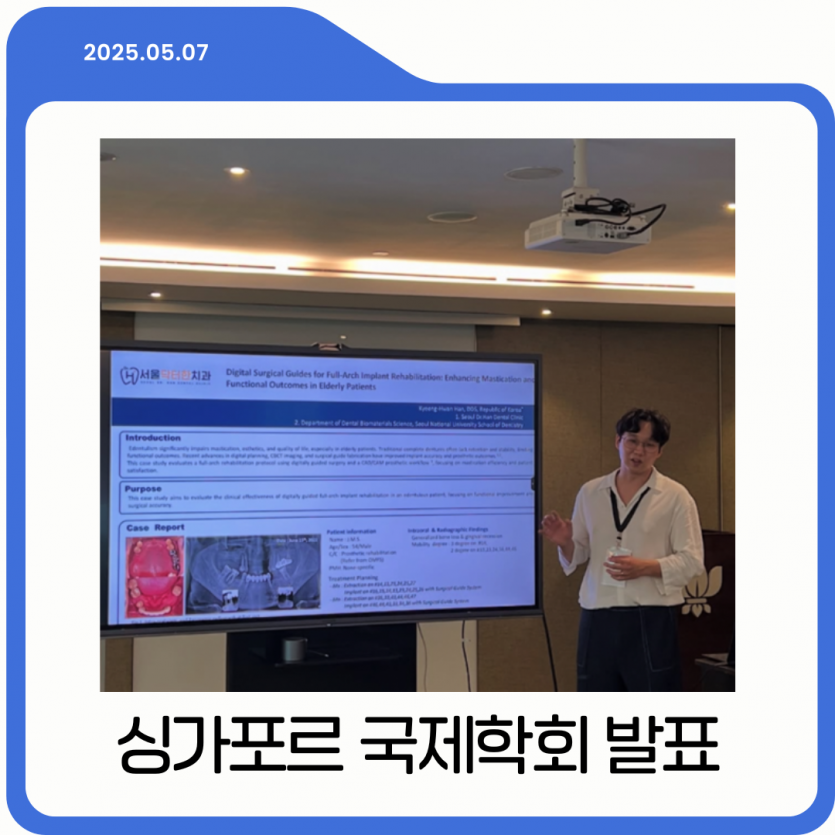 **“Full-Arch Digital Surgical Guide를 이용한 무치악 고난도 임플란트 치료 결과”**를 주제로 연구 발표를 진행했습니다.