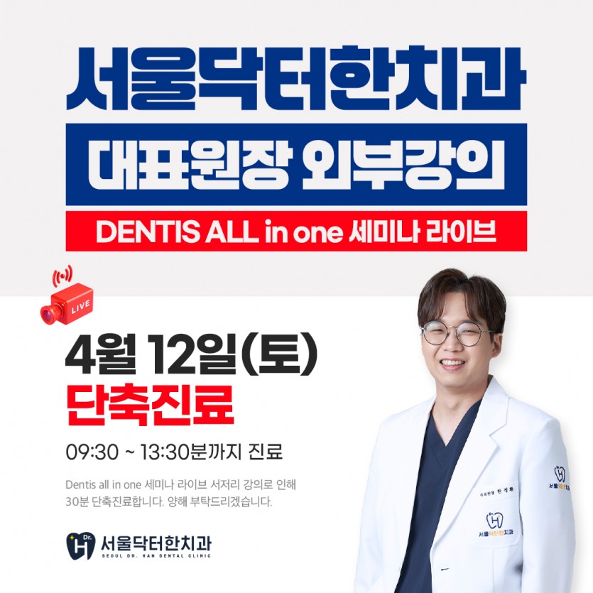 서울닥터한치과 4/12일(토) 단축 진료 안내입니다.