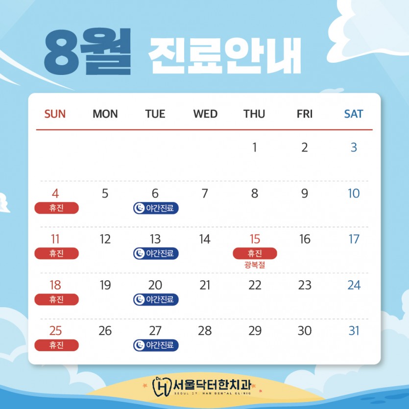 서울닥터한치과 24년 8월 진료 일정입니다.