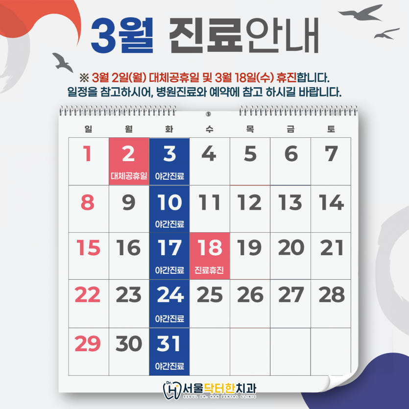 3월 진료 일정 및 휴진 안내|서울 중구 신당동 서울닥터한치과